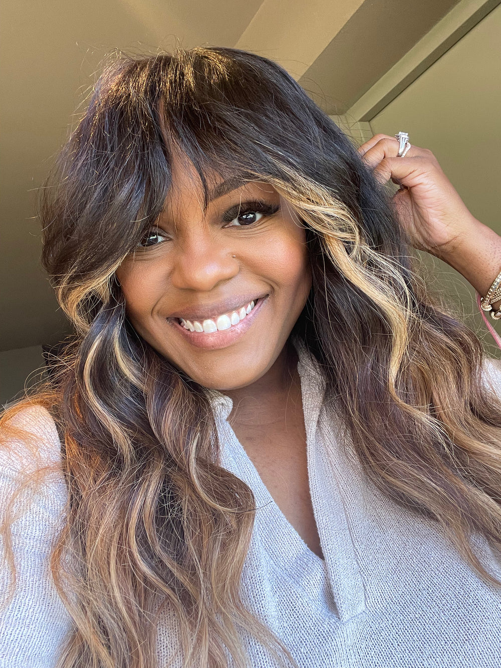 Meet Celine! She is a 20in custom colored brown/blonde balayage unit . She has a Blonde money piece with dark base and warm brown mids and blonde through to the ends.