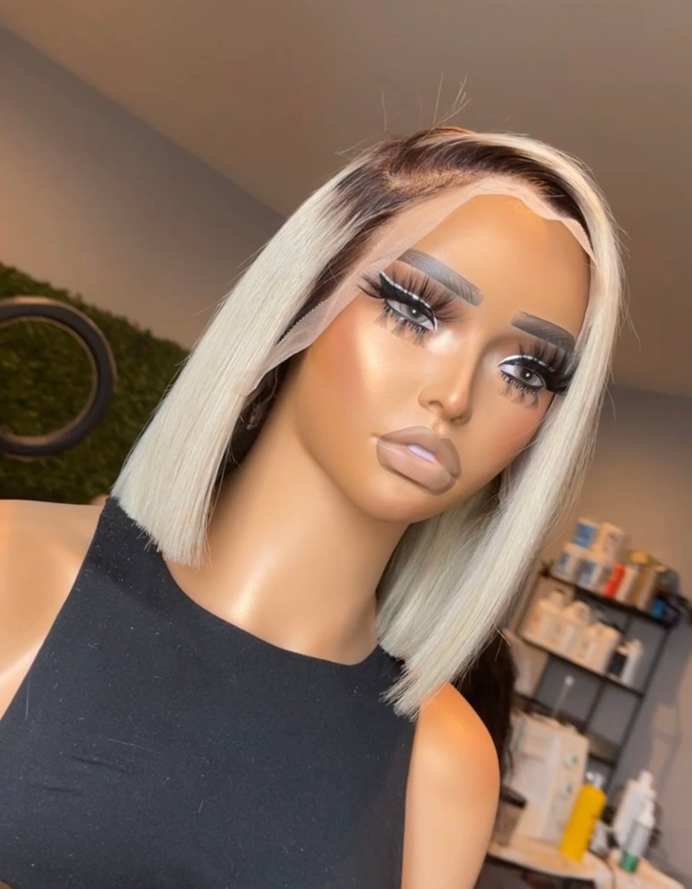 The Delaine is a pre-made 12in ice Blonde 6x6 Lace closure unit with a medium brown root. She can be worn as a side or middle part! Adjustable cap with a band and combs