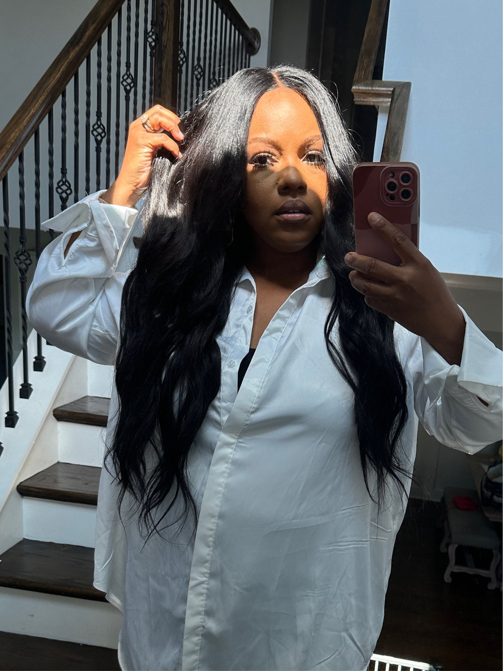 Natasha is a 26in Virgin hair unit. Colored Jet Black with a HD 5x5 Closure. She’s constructed on an adjustable cap with a band and combs for self Installation.
