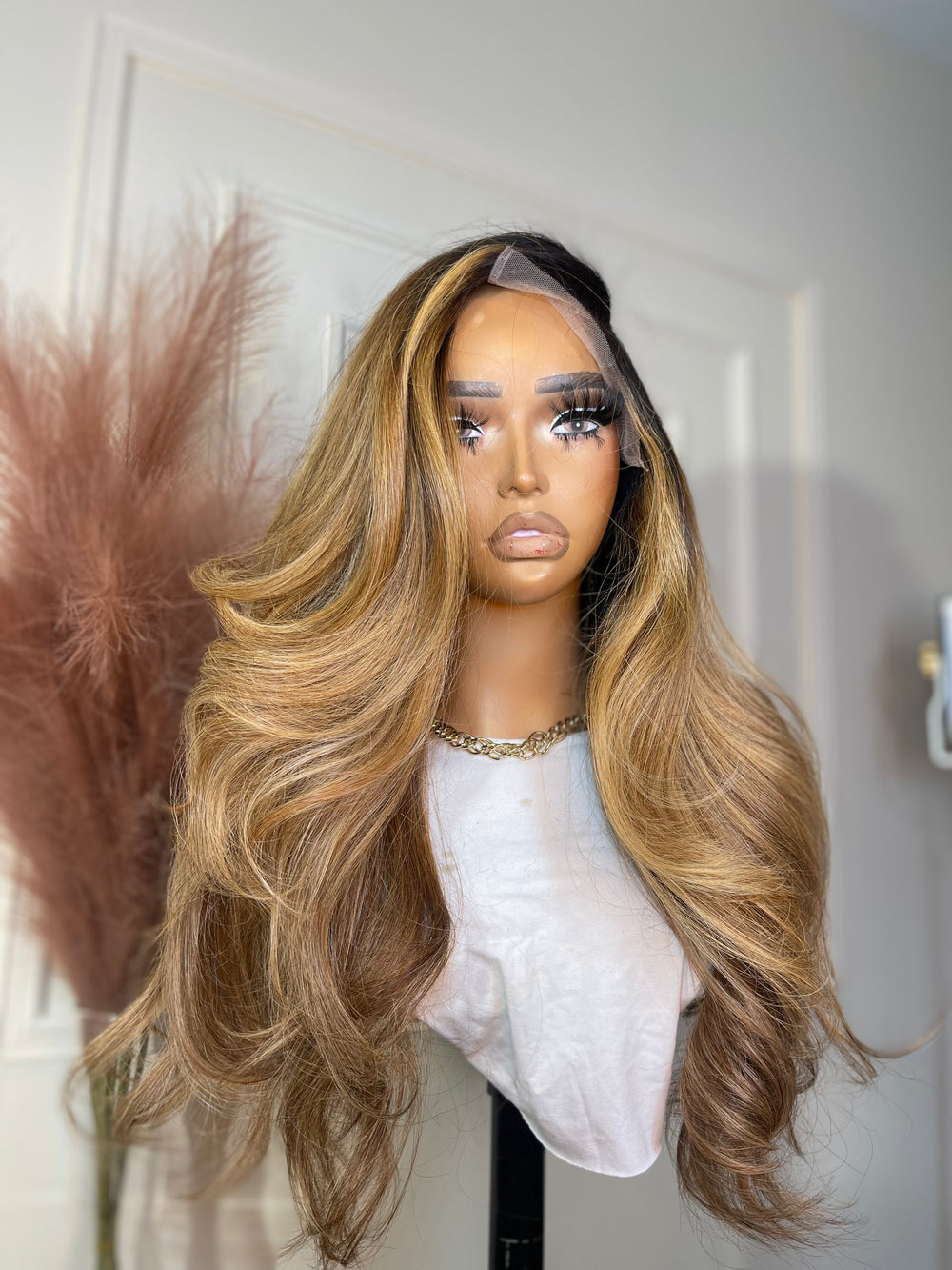 Meet Taj! Taj is a Glue-less Raw Laos unit custom colored with SunKissed Golden Blonde and Brown Highlights. She is 20 Inches and Has a 5x5 Ultra thin transparent Lace Closure.